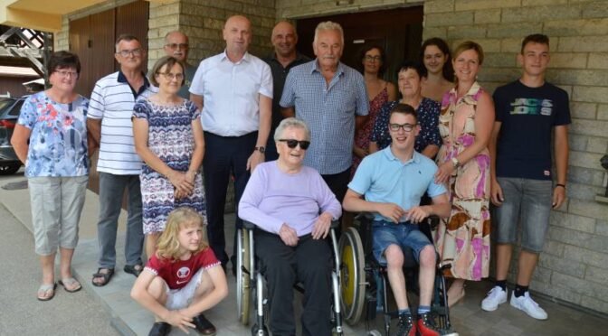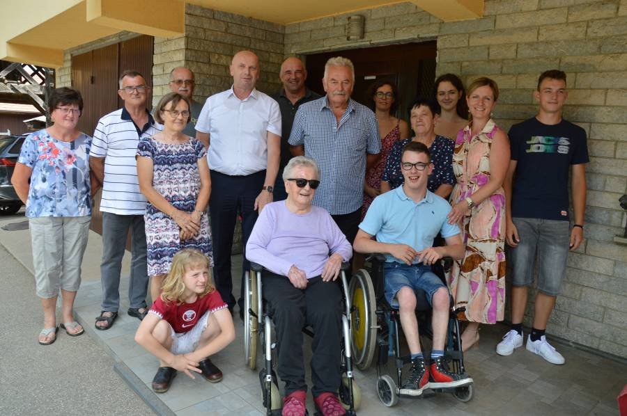 Slavljenka Ivica Mavsar (spredaj) v družbi župana Janeza Kerina, predsednika KS Gora Lojzeta Kerina in svojcev