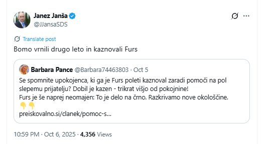 Ta incident odpira širše vprašanje o nepravičnosti davčnega sistema v Sloveniji. Medtem ko se Branko in podobni upokojenci bojijo vsakega dodatnega evra globe, ki bi jih potisnila v revščino, mediji poročajo o milijonskih davčnih dolgovih, ki zastarajo brez posledic. Primeri, kot sta Zoran Trifunović z 10–11 milijoni evrov dolga ali družina Janković z 29 milijoni evrov odpisanih obveznosti, kažejo na dvojna merila, kar pa je očitno tudi slovenski javnosti. Na zadevo se je na X odzval tudi predsednik SDS Janez Janša, ki je zapisal: “Bomo vrnili drugo leto in kaznovali Furs.”