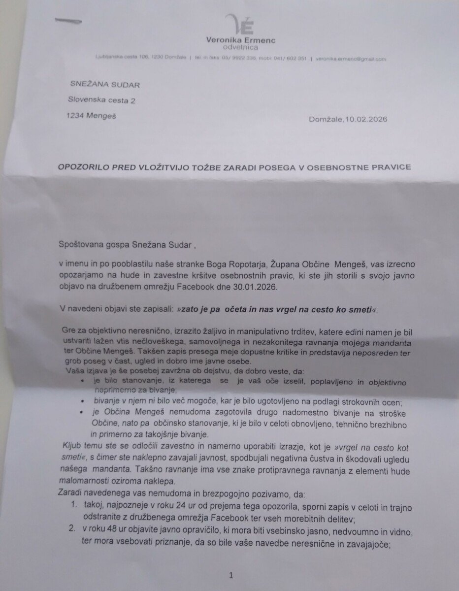 Se spomnite zgodbe 72-letnega Petra Sudarja iz Mengša, ki je moral zaradi potreb Občine Mengeš zapustiti neprofitno stanovanje, v katerem je bival z veljavno pogodbo za nedoločen čas? Njegova hči Snežana Sudar je zdaj prejela odvetniško opozorilo pred vložitvijo tožbe zaradi domnevnega posega v osebnostne pravice župana Boga Ropotarja.