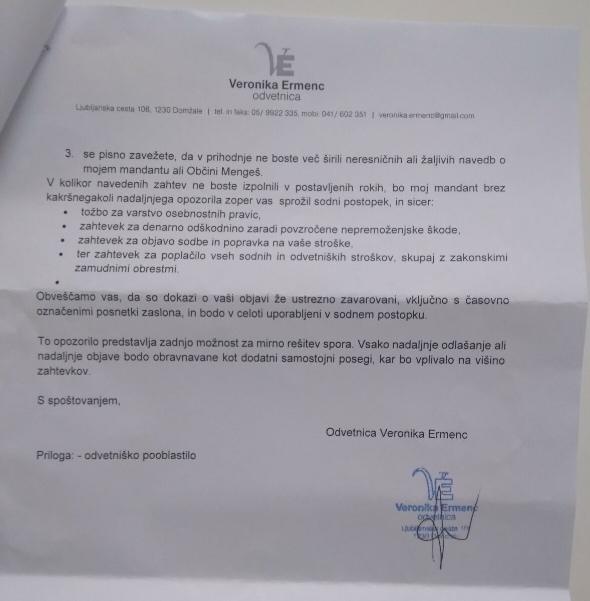 Vzrok je njen komentar na družbenem omrežju Facebook, kot je navedeno v dopisu, ki ga je v imenu župana Občine Mengeš poslal odvetnica Veronika Ermenc.