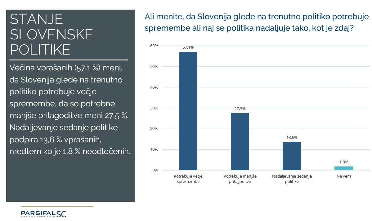 Še bolj alarmantni so podatki o potrebi po političnih spremembah: več kot polovica (57,1 odstotka) vprašanih zahteva velike spremembe, le 13,6 odstotka podpira nadaljevanje sedanje politike, kar kaže na široko razširjeno frustracijo med državljani.