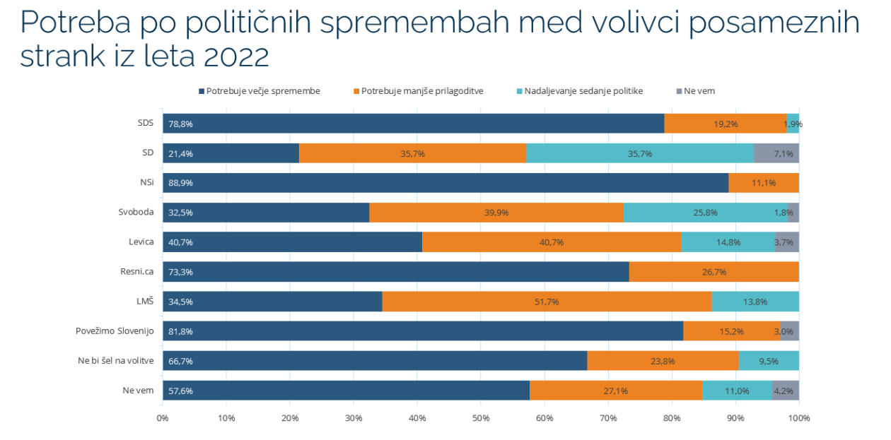 Med volivci strank je želja po velikih spremembah najmočnejša med podporniki opozicijskih strank: SDS (78,6 odstotka) in NSi (81,9 odstotka). Nadaljuje Resni.ca (73,3 odstotka) in SNS (72,5 odstotka). Volivci vladajočih strank, kot sta Svoboda (32,5 odstotka za velike spremembe) in Levica (40,7 odstotka), so bolj naklonjeni manjšim prilagoditvam ali ohranitvi statusa quo. To kaže na globoko politično razklanost, kjer velika večina volivcev vidi trenutno vlado kot vir problemov.