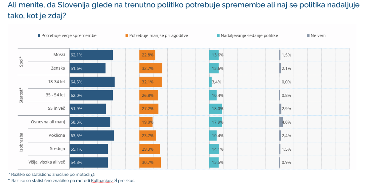 Demografske razlike so tu manj izrazite, a opazne: moški so nekoliko bolj naklonjeni velikim spremembam (62,1 odstotka) kot ženske (51,6 odstotka). Starejši (55+) so najbolj radikalni (62 odstotkov za velike spremembe), najmlajši pa bolj zmerni (32,1 odstotka za velike, 37 odstotkov za manjše). Po izobrazbi prevladuje želja po spremembah med višje izobraženimi.