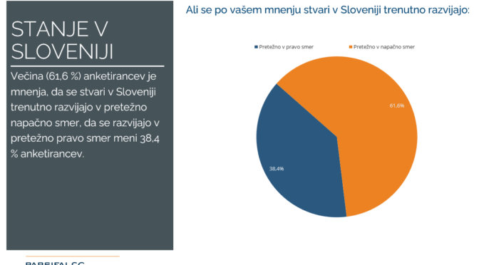 Nedavna javnomnenjska raziskava agencije Parsifal razkriva globoko nezadovoljstvo Slovencev s trenutnim stanjem v državi in politiko. Kar 61,6 odstotka anketirancev meni, da se Slovenija razvija v napačno smer, medtem ko le 38,4 odstotka verjame, da gre v pravo smer.
