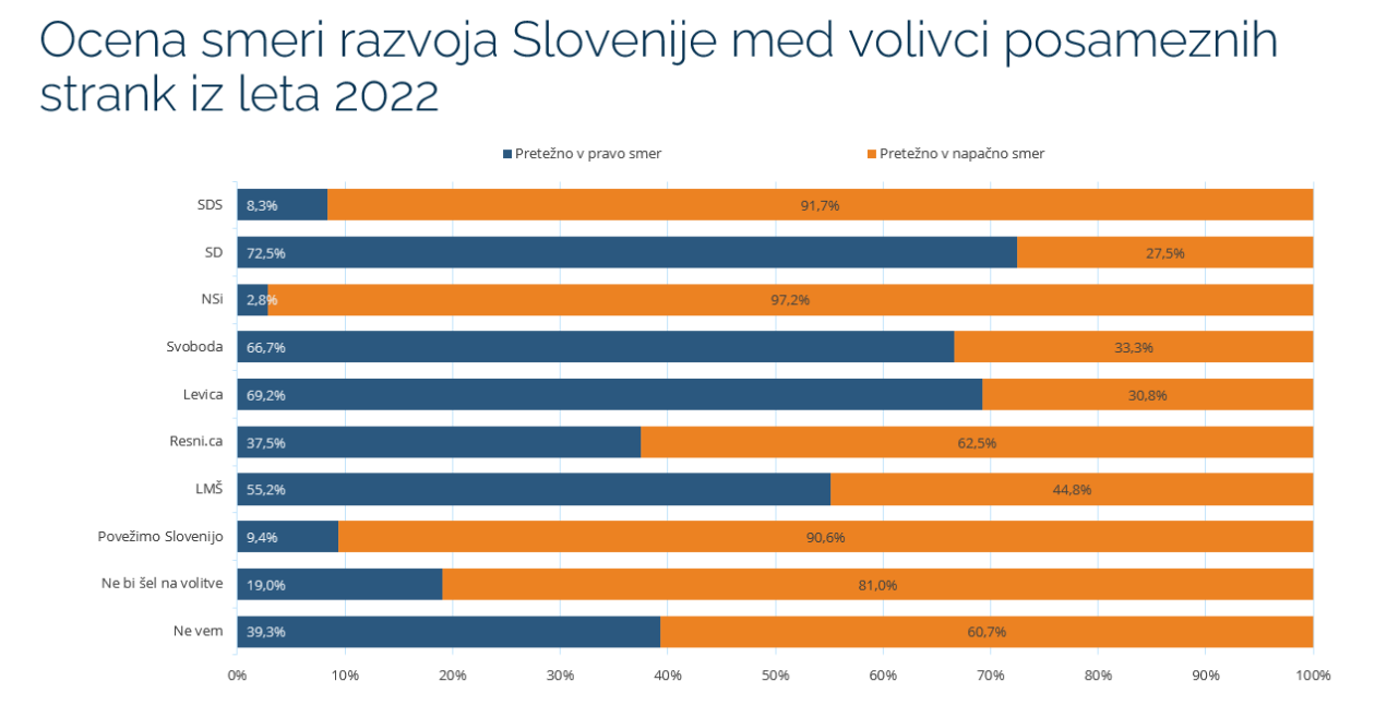 Ocena smeri razvoja Slovenije med volivci posameznih strank iz leta 2022 je še bolj polarizirana. Volivci SDS so najbolj kritični – kar 91,7 odstotka jih meni, da gre v napačno smer. Podobno velja za NSi (92,7 odstotka) in Resni.co (83,7 odstotka). Nasprotno pa volivci Svobode vidijo stvari bolj pozitivno (30,9 odstotka meni, da gre v napačno smer), kar kaže na močno delitev med podporniki vladajoče koalicije in opozicije. Volivci Levice in SD so nekje vmes, z okoli 40–50 odstotki pesimistov.