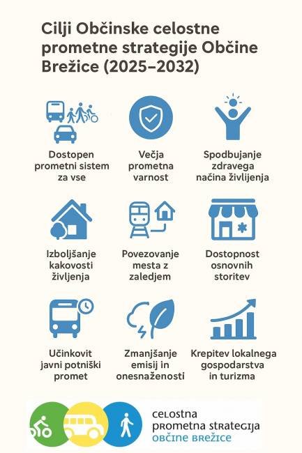 kolesarjenje in uporabo javnega prevoza tudi v zaledju mesta Brežice, kar je ključnega pomena za izboljšanje povezanosti občine po načelih trajnostne mobilnosti. Ključni cilji nove strategije vključujejo: večjo prometno varnost, socialno vključenost, bolj zdrave prebivalce, izboljšano kakovost življenja, učinkovito povezovanje mesta z zaledjem, dostopnost storitev, zmanjšanje emisij ter krepitev lokalnega gospodarstva in turizma. Strategija temelji na širokem sodelovanju javnosti in deležnikov ter vključuje akcijski načrt za izvedbo ukrepov do leta 2032.
