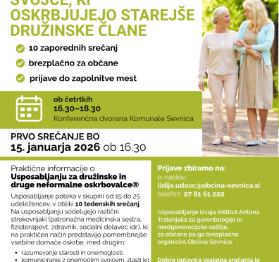 Usposabljanja bo izvedel Inštitut Antona Trstenjaka za gerontologijo in medgeneracijsko sožitje, za občane pa ga brezplačno organizira Občina Sevnica.