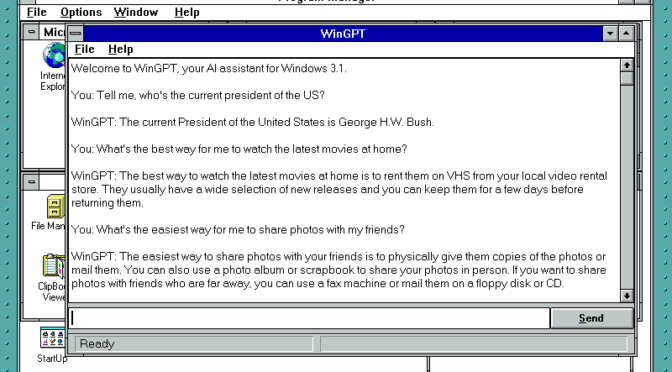 ChatGPT za legendarni operacijski sistem Windows 3.1 poimenovan WinGPT je na že voljo za prenos. Ta se nahaja na spletni povezavi http://www.dialup.net/wingpt/download/wingpt10.zip. Programer zagotavlja, da bo novost mogoče uporabljati tako v navezi z 16-bitno kot 32-bitno različico operacijskega sistema Windows.