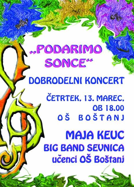 V letošnjem šolskem letu prirejamo dobrodelni koncert z naslovom »Podarim sonce«. Tokrat bosta otroški in mladinski pevski zbor sodelovala z Big bendom Sevnica in Majo Keuc, s plesnimi vložki pa bodo nastopili prav vsi učenci in učenke osnove šole. Koncert se bo odvil 13. marca ob 18. uri v telovadnici Osnovne šole Boštanj. Zbrana sredstva bomo namenili šolskemu skladu. Lepo vabljeni.