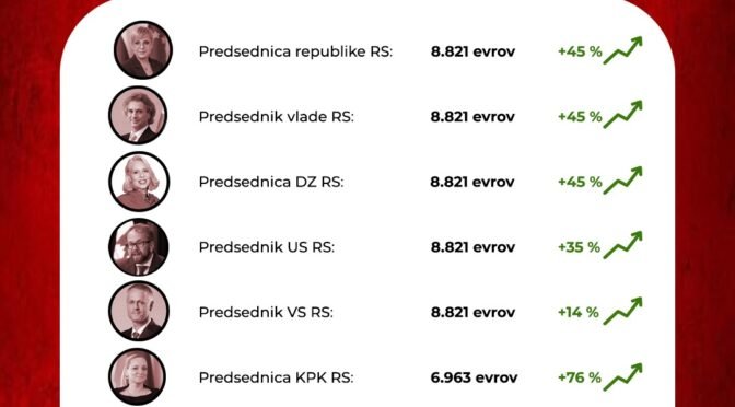 S prenovo plačnega sistema v javnem sektorju, ki je začela veljati 1. januarja 2025, so se osnovne bruto plače najvišjih funkcionarjev dvignile na kar 8.821 evrov – to je povečanje za 45 odstotkov za predsednika vlade Roberta Goloba, predsednico republike Natašo Pirc Musar in predsednico Državnega zbora Urško Klakočar Zupančič. Podobno so se plače dvignile tudi za predsednika Vrhovnega sodišča (za 14 odstotkov) in druge ključne položaje, medtem ko so direktorji in funkcionarji v povprečju dobili kar 41- do 50-odstotno povišanje, kar pomeni do 2.072 evrov bruto več na mesec. Celotna reforma bo davkoplačevalce stala neverjetnih 1,4 milijarde evrov, a večina tega denarja gre v žepe tistih, ki so že zdaj na vrhu verige.