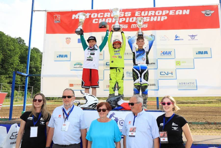 Na odru eropskega prvenstva EMX-65 v Jaski (od leve): Francesco Assini (Italija), zmagovalec Roko Ivandić (Hrvaška) in Alex Novak (Slovenija).