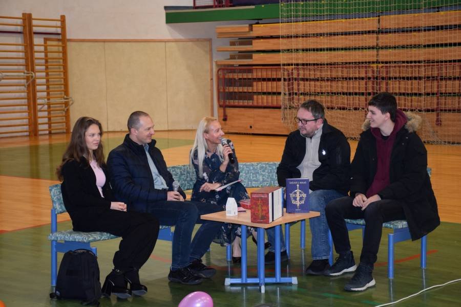 V nadaljevanju programa, ki so ga dijaki tudi glasbeno obarvali, je profesorica Krista Lapuh Krulc vodila pogovor z dvema dijakoma in njihovima staršema iz podjetniških družin – s Timom Motoretom in njegovim očetom Aljošo (družinsko podjetje 5ka) ter Piko Skrivalnik in njenim očetom Dejanom, sicer zaposlenim v NEK in solastnikom podjetja Metron.