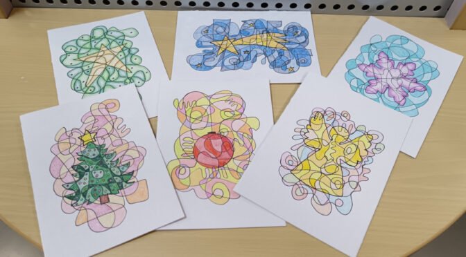 To je le nekaj motivov, ki so jih udeleženke na ustvarjalni delavnici v ponedeljkovem popoldnevu, 15. decembra 2025, obdale z natančnimi, ponavljajočimi se vzorci in jim tako dodale povsem osebno noto. Pod njihovimi rokami so na leposlovnem oddelku Knjižnice Brežice nastale unikatne praznične voščilnice, namenjene dragim naslovnikom, vsaka s svojo zgodbo in sporočilom.