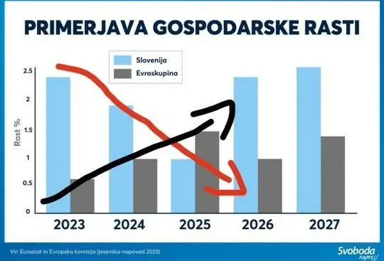 Po mnenju mednarodnih institucij je bila Slovenija v času naše vlade 2. najbolj uspešna država in Golobova vlada je dobila polne kašče. Danes je gospodarska rast za 30 % nižja od povprečja EU. ⚠️ pic.twitter.com/DDaZhZWP5l