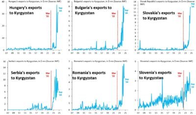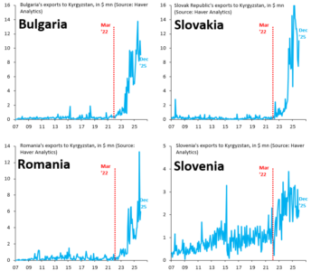 Inštitut Brookings je države, kot so Nemčija, Poljska, Litva, Italija, Češka in Srbija, opredelil kot nekatere od držav, katerih izvoz v Kirgizijo se je po rusko-ukrajinski vojni povečal. Kot take bi lahko potencialno še naprej trgovale z Rusijo prek Kirgizije. Še bolj pa se je povečala trgovinska menjava med Kirgizijo in Rusiji prijaznimi državami – Slovaško, Madžarsko, Bolgarijo, Srbijo in Romunijo. Kot rečeno je med njimi tudi Slovenija, čeprav je uradna politika Slovenije prozahodna. A kot rečeno – le dekleratorno.