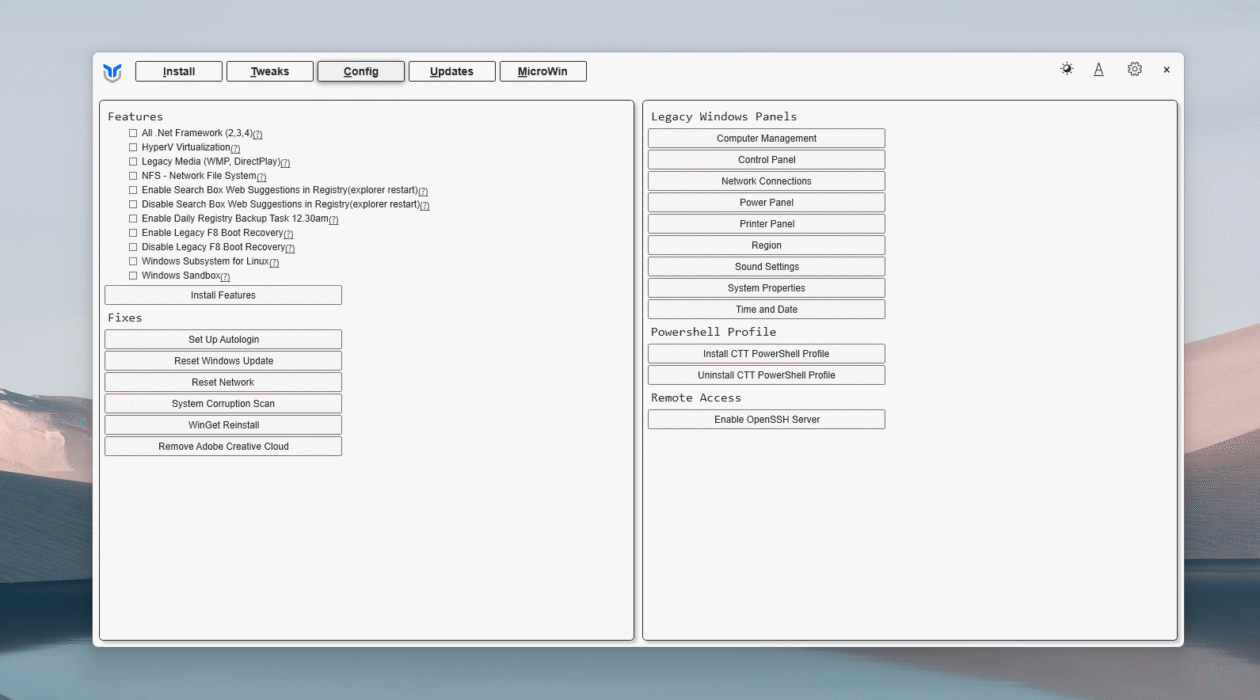 Tretji zavihek (Config, konfiguracija sistema) združuje različna orodja za konfiguracijo in vzdrževanje Windowsa. Omogoča dostop do nekaterih klasičnih nadzornih plošč in nastavitev, ki jih v modernem vmesniku Windows 11 ni enostavno najti. Tu so na voljo tudi hitri popravki in diagnostika, na primer orodje za preverjanje integritete sistemskih datotek in popravilo (DISM), ponastavitev omrežnih nastavitev, nastavitev samodejne prijave v Windows, integrirano zaganjanje orodja O&O ShutUp10++ za zasebnost (več o tem v nadaljevanju) in še več. WinUtil v ozadju avtomatizira tudi zahtevnejše postopke, tako da lahko uporabnik s pritiskom na gumb izvede na primer popravilo Windows Update komponent ali odstrani ostanke določenih problematičnih programov (Adobe Creative Cloud Cleaner za popolno odstranitev Adobe programov). S tem Config deluje kot nekakšen švicarski nož za razne administrativne naloge v Windowsu – vse na enem mestu.