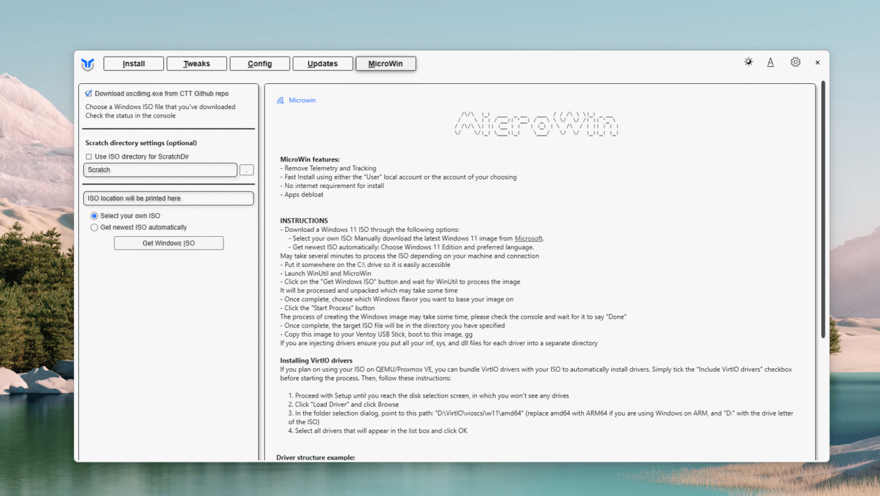 Zadnji zavihek (MicroWin) predstavlja edinstveno funkcijo orodja WinUtil. Omogoča ustvarjanje minimalne namestitvene ISO slike Windowsa 10/11 brez navlake. Z drugimi besedami: orodje lahko prenese originalno sliko Windowsa in jo predela v lažjo verzijo, ki ne vključuje nobene privzeto nameščene aplikacije. Tak »osiromašen« Windows je odlično izhodišče za čist in optimiziran sistem, saj po sveži namestitvi vsebuje le najnujnejše, WinUtil pa je že vgrajen za nadaljnjo prilagoditev.