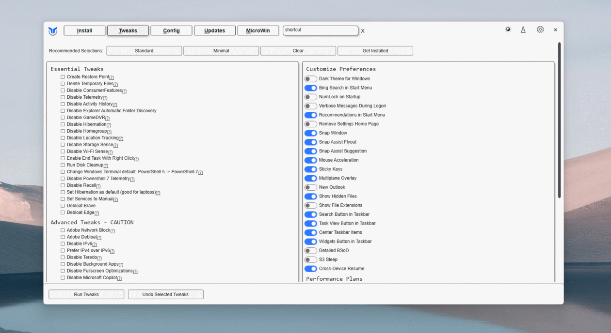 Prilagoditve ali Tweaks je zavihek z raznimi nastavitvami za izboljšanje delovanja, zasebnosti in videza sistema. Sem spadajo številne praktične optimizacije, ki so razdeljene na osnovne (Essential Tweaks) in napredne (Advanced Tweaks). Osnovne prilagoditve vključujejo splošno varne spremembe, ki jih lahko uporabi večina uporabnikov in prinesejo takojšnje koristi, na primer onemogočanje nepotrebne telemetrije in zmanjšanje števila nepotrebnih storitev, ki se izvajajo v ozadju.
