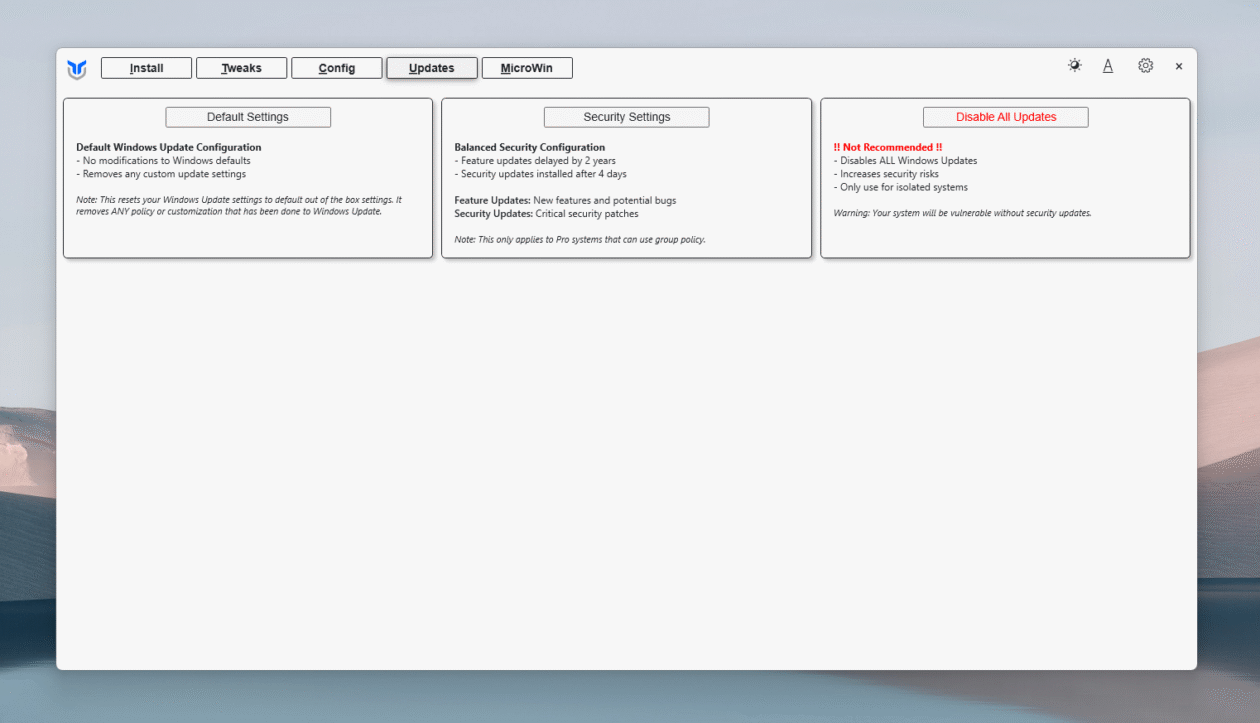 Windows Utility zato ponuja preproste prednastavitve za ravnanje z posodobitvami. Privzeto so nastavitve nespremenjene (Windows Update deluje normalno), uporabnik pa lahko z enim klikom vključi avtorjevo priporočeno politiko posodobitev, ki Windows nastavi tako, da namesti le varnostne posodobitve in prestavi večje nadgradnje funkcij. To pomeni, da bodo mesečni varnostni popravki nameščeni z nekaj dnevnim zamikom. V primeru, da Microsoft res izda popravek s skrito napako, se lahko s to politiko izognete težavam in počakate na naslednji popravek. Ta bolj agresivna politika večje nadgradnje (Feature Updates) odloži tudi za do 2 leti.