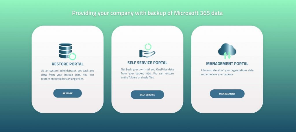 Anycloud Backup for 365 je ločen na tri portale. Sistemski administrator v portalu za upravljanje določi pogostost varnostnih kopij. Te se lahko izvajajo večkrat dnevno, tedensko, mesečno ali letno. Podatki se hranijo do 10 let, Anycloud pa pripravlja tudi možnost 25-letne varne hrambe. Kreiranje varnostne kopije celotnega okolja traja le nekaj minut, na voljo pa so tudi poročila za vsako kopijo ali postopek obnovitve, vključno s podatki, kdo je zahteval varnostno kopijo/obnovitev in kaj ter kdaj so se podatki obnovili. Sistemski administrator lahko obnovi celotne mape ali pa le posamezne datoteke.