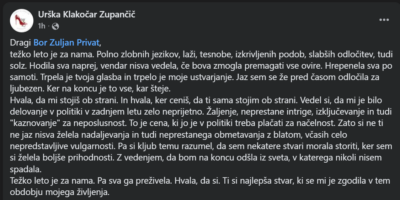 “Vedel si, da mi je bilo delovanje v politiki v zadnjem letu zelo neprijetno. Žaljenje, neprestane intrige, izključevanje in tudi “kaznovanje” za neposlušnost,” piše v svoji javni izpovedi kitaristu Boru Zuljanu.