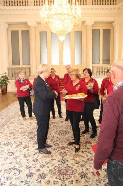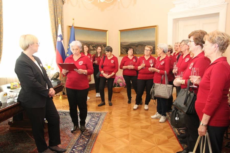 Doživele smo prisrčen sprejem in začutile žensko energijo. Predstavila nam je nekatera protokolarna darila in nas popeljala v svojo pisarno, kjer nam je poleg umetniških del v njej predstavila še del svoje bogate zbirke sovic, simbola modrosti, ki jo potrebuje na svojem položaju. Zdravka Kampijut, predsednica našega društva, ji je predstavila naše 49-letno delovanje. Podarile smo ji naš bizeljski ajdov kolač in ženitovanjsko srce, kruh v obliki srca, ki je znak našega društva in s katerim smo, kot nosilke, vpisane v Register nesnovne kulturne dediščine. Izročile smo ji tudi pozdrave za njeno mamo, ki je odrasla v našem kraju, v Drenovcu pri Bukovju. Predsedničine sodelavke so nam predstavile zgodovino palače in nekatere zanimivosti v njej.