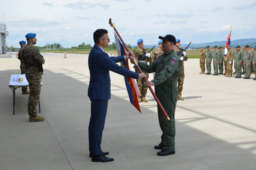 Predaja bojne zastave obrambnega ministra Marjana Šarca poveljniku 15. brigade vojaškega letalstva in zračne obrambe polkovniku Janezu Gaubetu