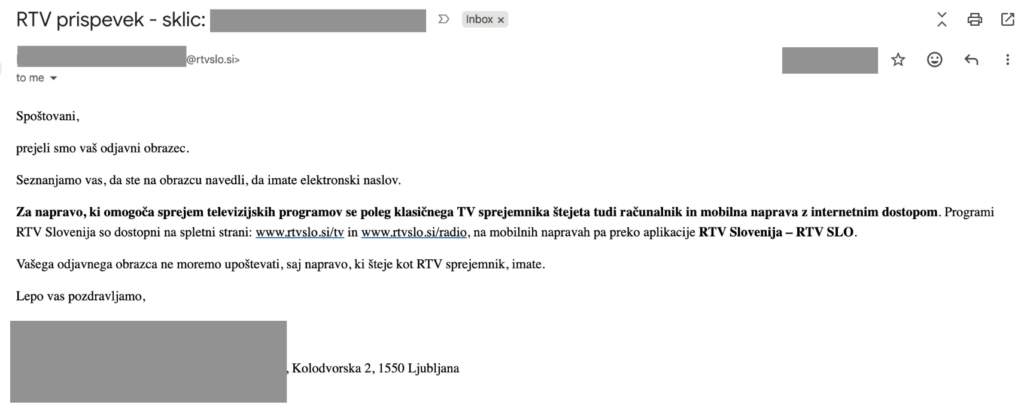 Takih naslovov je na svetovne spletu še zelo veliko. Tako je zapisala ena od uporabnic. Če je kdo morda sanjal o odjavi od RTV prispevka, delim mojo komunikacijo z njimi. Po pošti sem poslala odjavo, podpis sem šla overiti na upravno enoto. Na mojo odjavo sem prejela sledeči mail. “Seznanjamo vas, da ste na obrazcu navedli, da imate elektronski naslov. Za napravo, ki omogoča sprejem televizijskih programov, se poleg klasičnega TV sprejemnika štejeta tudi računalnik in mobilna naprava z internetnim dostopom. Vašega odjavnega obrazca ne moremo upoštevati, saj napravo, ki šteje kot RTV sprejemnik, imate,” so ogorčeni uporabnici odgovorili z RTV Slovenija.