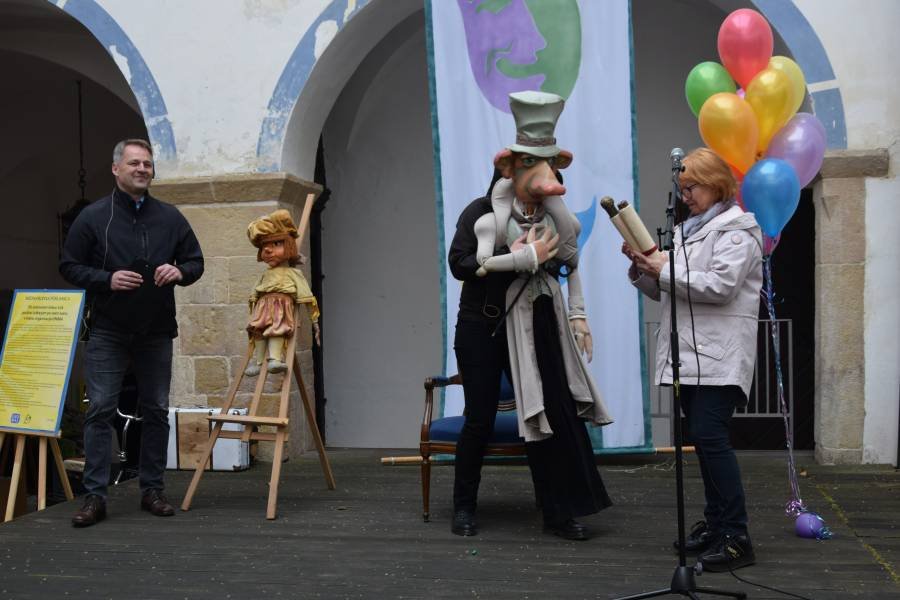 Članica GLG Sevnica Marjana Štojs je prebrala letošnjo mednarodno poslanico ob svetovnem dnevu lutk, ki ji je prisluhnil tudi minister za kulturo iz dežele Lutkanije.