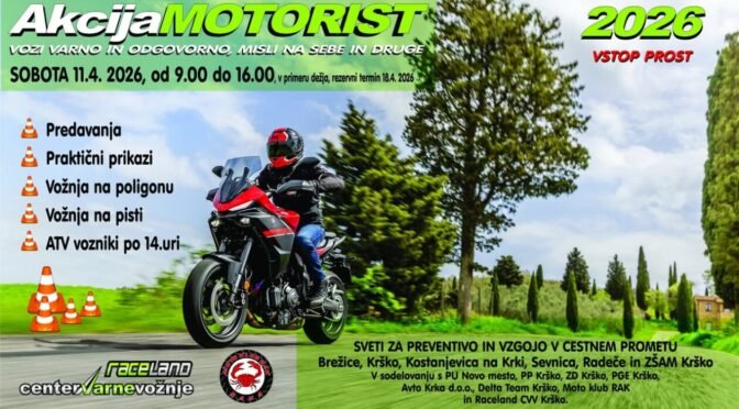 V soboto, 11. 4. 2026, vabljeni v Center varne vožnje Raceland, kjer bo od 9.00 do 16.00 potekala vsakoletna akcija Motorist. 🏍️