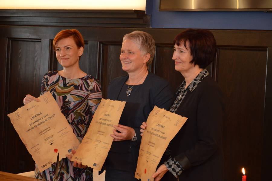 Z leve: ministrica za kulturo dr. Asta Vrečko, županja Občine Kozje Milenca Krajnc in direktorica Kozjanskega parka mag. Valerija Slemenšek so nove pridobitve na gradu Podsreda …
