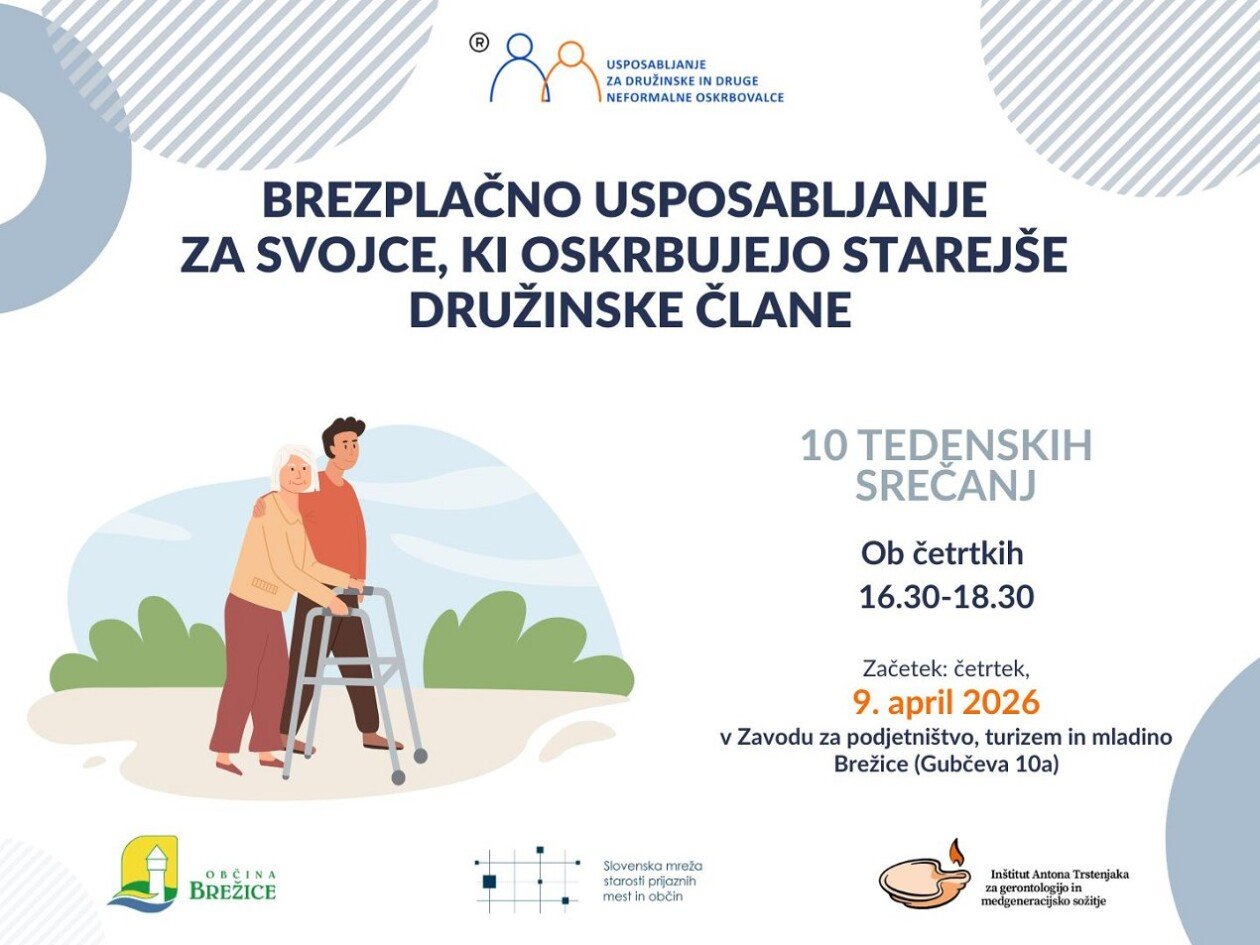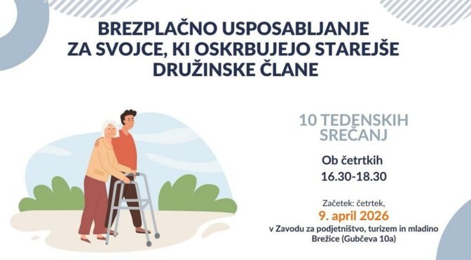 Postani usposobljen neformalni oskrbovalec – znanje, ki olajša življenje – Izvajalec usposabljanj je Inštitut Antona Trstenjaka za gerontologijo in medgeneracijsko sožitje. Izvedli bodo 10 tedenskih srečanj v skupini od 15 do 25 udeležencev. Prvo srečanje bo potekalo v četrtek, 9. aprila 2026, ob 16.30 v prostorih ZPTM Brežice.