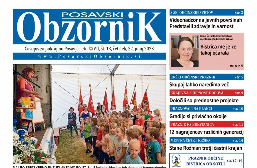 Pripravili smo tudi tematske strani pred praznikom občine Bistrica ob Sotli z nagovorom župana Franja Debelaka, seznamom prireditev, predstavitvami občinskih nagrajencev, prispevkom o zbiranju bistriških zgodb, povezanih z naravno dediščino, ter voščili prvih mož ostalih posavskih občin. Iz bistriške občine prihaja tudi naša tokratna sogovornica v glavnem pogovoru za časopis – Irena Černelč, knjižničarka, mentorica študijskih krožkov in še marsikaj.