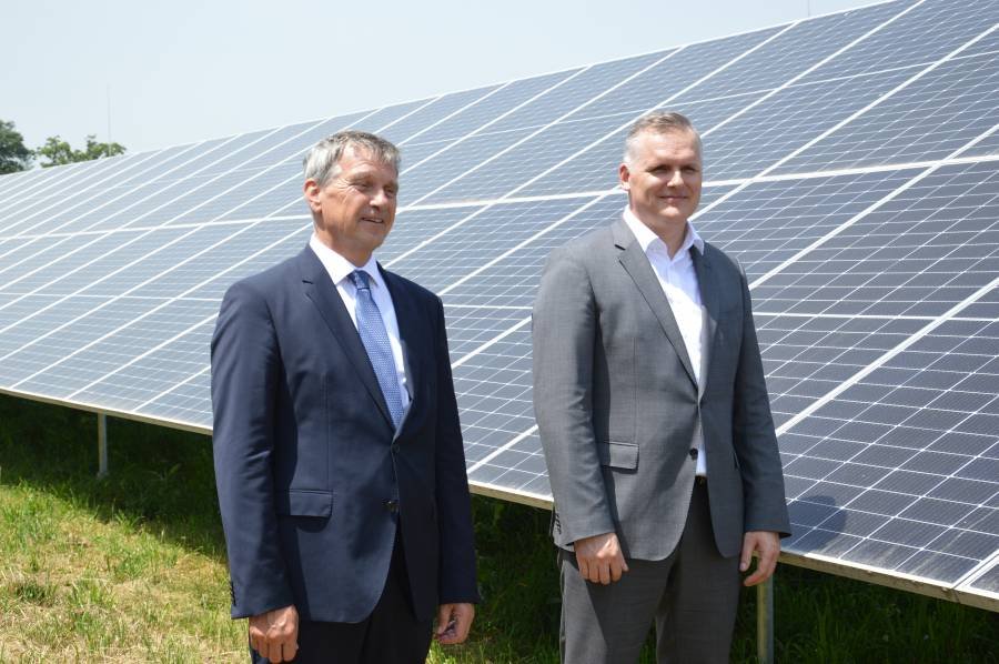 Direktor HESS Bogdan Barbič (levo) ter minister za okolje, podnebje in energijo mag. Bojan Kumer ob solarnih panelih