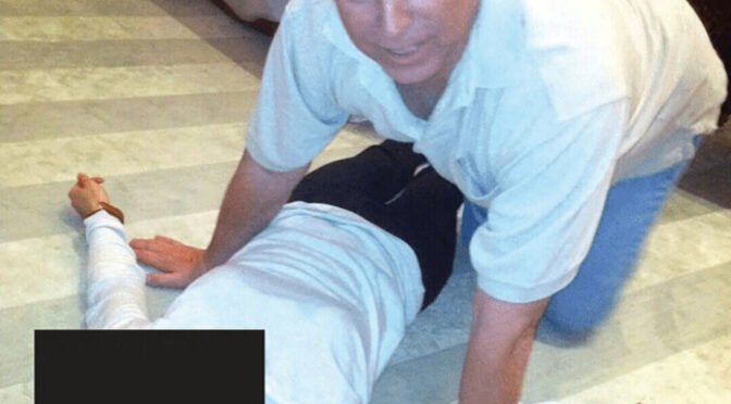 V isti objavi dokumentov je bila objavljena tudi fotografija neznanega datuma in lokacije, na kateri Mountbatten-Windsor kleči nad žensko, ki leži na tleh.