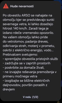 Agencija RS za okolje je izdala rdeče opozorilo zaradi močnega severnega vetra, ki bo pihal do 36 ur s sunki do 140 km/h. Pričakujejo vetrolome, ruvanje dreves in poškodbe objektov. Civilna zaščita je v visoki pripravljenosti in poziva k previdnosti ter zavarovanju predmetov. Sprožen bo SI-ALARM.