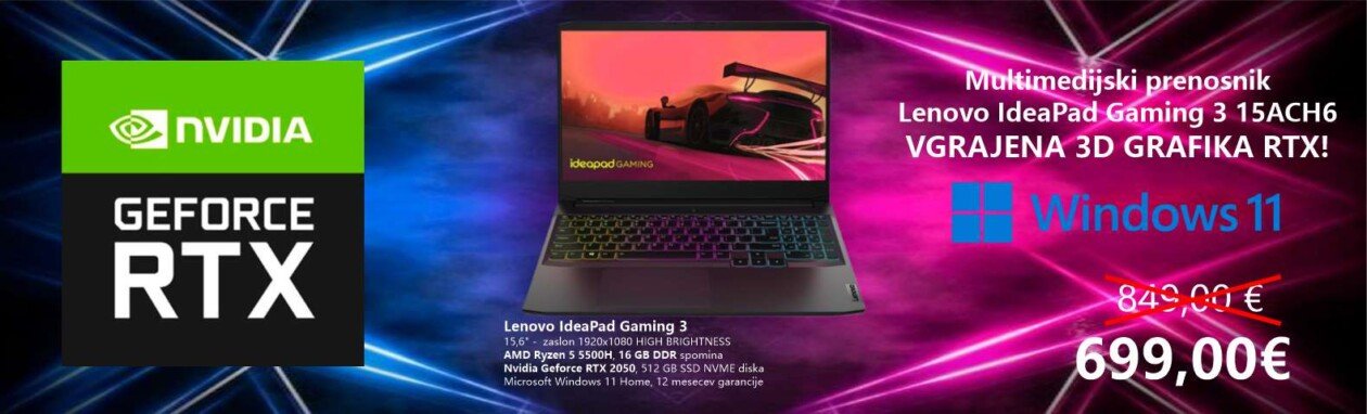 Najpomembnejša pa je ločena 3D grafična kartica RTX2050 z lastnim spominom, ki bo poganjala 3D izračune. Nekoč je veljalo, da stane osnovni gamerski prenosnik, ki je sposoben zaganjati igre, vsaj 950 EUR. Danes temu več ni tako. Solidno opremljen Lenovo IdeaPad Gaming 3 je po akcijski ceni 699 EUR z DDV že dobavljiv TUKAJ.