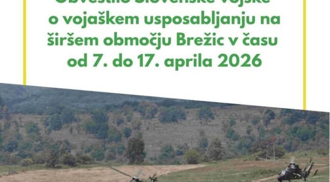 Slovenska vojska obvešča, da bo od torka, 7., do petka, 17. aprila 2026, na širšem območju južno od Čateža ob Savi potekalo terensko usposabljanje pripadnikov 10. izvidniškega bataljona Prve brigade SV.