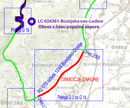 Popolna zapora bo vzpostavljena od 1. 12. 2025 od 7.00 do 5. 12. 2025 do 17.00, pri čemer bosta potrebna dva (2) dneva popolne zapore v navedenem intervalu. V času popolne zapore bo zagotovljen obvoz po občinski cesti LC 024361 Bizeljska vas–Ledine.
