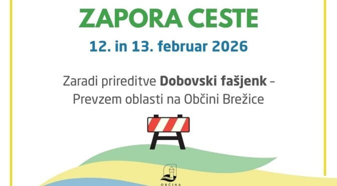 Zaradi prireditve Dobovski fašjenk – Prevzem oblasti na Občini Brežice bo v četrtek, 12. 2. 2026 od 18. ure naprej zaprto parkirišče od občinske stavbe do kavarne Žagar na obeh straneh. V petek, 13. 2. 2026, pa se ob 10. uri zapre levi zavijalni pas na Bizeljski cesti oziroma del Ceste prvih borcev v smeri gradu.