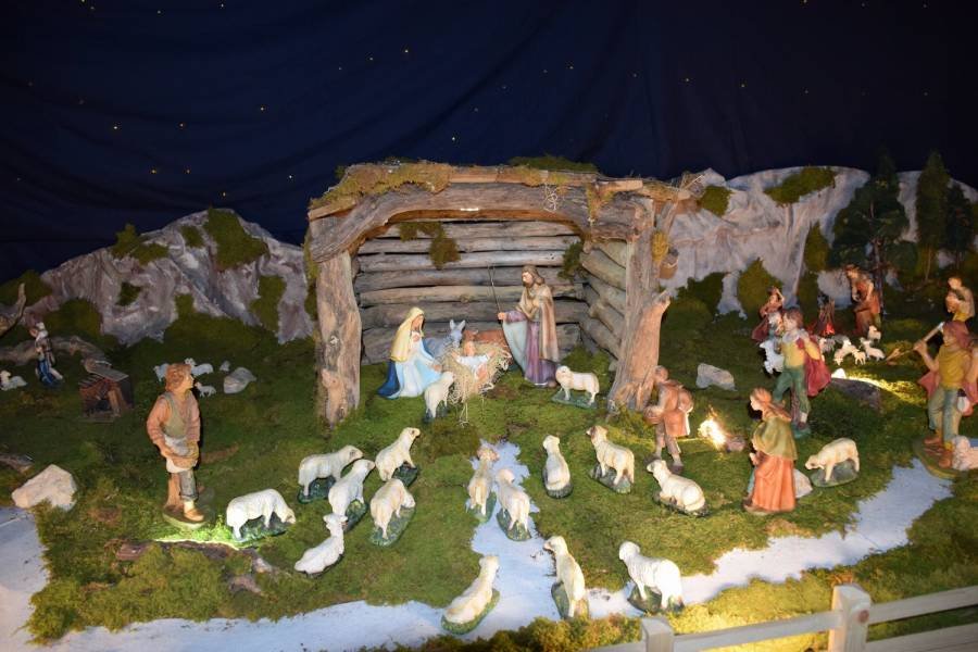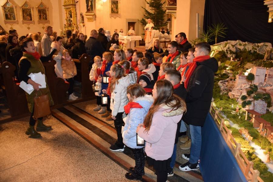 Po slovesnem vhodu v cerkev so najprej zapeli pri velikih jaslicah, ki jih (seveda tudi s pomočniki) že leta pripravljata uvodoma omenjena jasličarja. Vsako leto so zasnovane nekoliko drugače in vsebujejo tudi številne elemente domače pokrajine, od župnijske in nekaterih podružničnih cerkva do mosta čez Krko, vinogradov in polj itd. Jaslice so tradicionalno postavljene tudi na trgu oz. na prireditvenem prostoru pred cerkvijo.