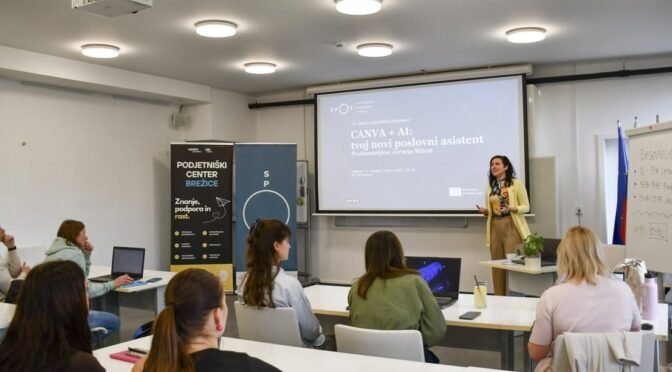 💻 17. marca 2026 je potekalo še predavanje z delavnico Canva + AI: tvoj novi poslovni asistent, kjer so udeleženci pod vodstvom Jerneje Milost spoznali uporabo sodobnih digitalnih orodij pri pripravi poslovnih materialov.