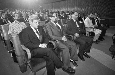 Clani predsedstva sedijo na seji ustanovnega zbora Skupscine po prvih parlamentarnih volitvah v Sloveniji. Milan Kucan, Ciril Zlobec, Ivan Oman, Dusan Plut, Matjaz Kmecl