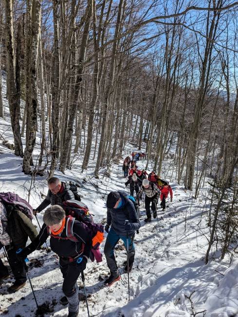 Z avtobusom smo se nato odpeljali v Tiho dolino, kjer so nam domači vodniki predstavili športni park, poimenovan po Edmundu Čibeju, učitelju, kronistu in pobudniku ustanovitve ajdovske podružnice Slovenskega planinskega društva. Po rahlo zasneženi cesti smo začeli pohod po čudovitem bukovem gozdu. Kmalu smo prišli na dobro označeno kolovozno pot, ki je postajala vse bolj strma. S krajšimi postanki smo omogočali veliki skupini, da smo hodili skupaj. Po približno uri hoda smo prišli na križišče, kjer je bila možnost nadaljevati pot cesti do planinske koče ali po strmi poti na naš načrtovan vrh Mali Golak. Odločitev je padla, da gremo po strmi poti vsi na vrh. Da pa je tam burja doma, smo opazili, ko smo prečkali nekaj zametov.