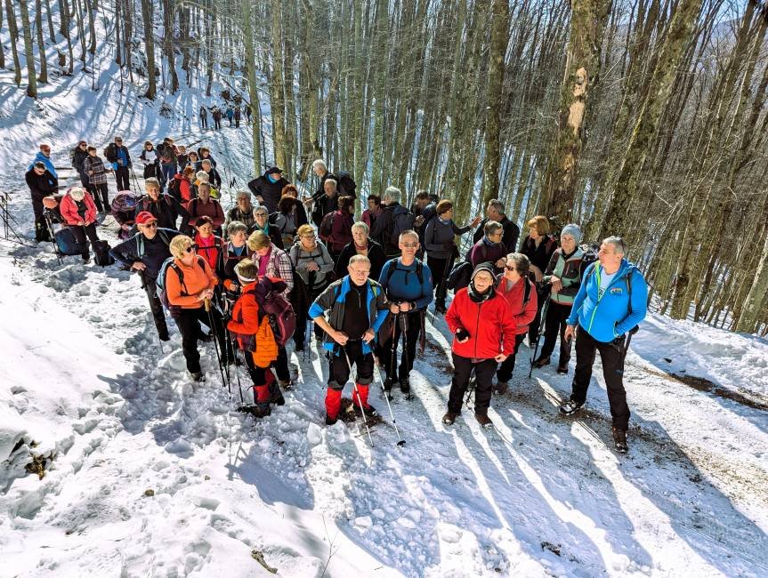Starejša skupina pohodnikov posavskih planinskih društev je v četrtek, 20. 2. 2025 organizirala planinski izlet na najvišji vrh Trnovskega gozda Mali Golak, 1495 m. S polnim avtobusom smo se odpeljali iz Posavja v Predmejo.