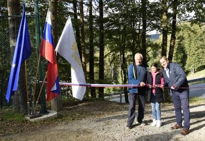 Pri slovesnem prerezu traku sta sodelovala domačin Jože Šušteršič in radeški župan Tomaž Režun v družbi mlade domačinke.