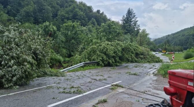 V današnjem kratkotrajnem dopoldanskem neurju je močan veter podrl nekaj dreves na regionalno cesto Sevnica-Planina, tako da so pristojne službe že na delu ter čistijo cestišče, ki je trenutno neprevozno.