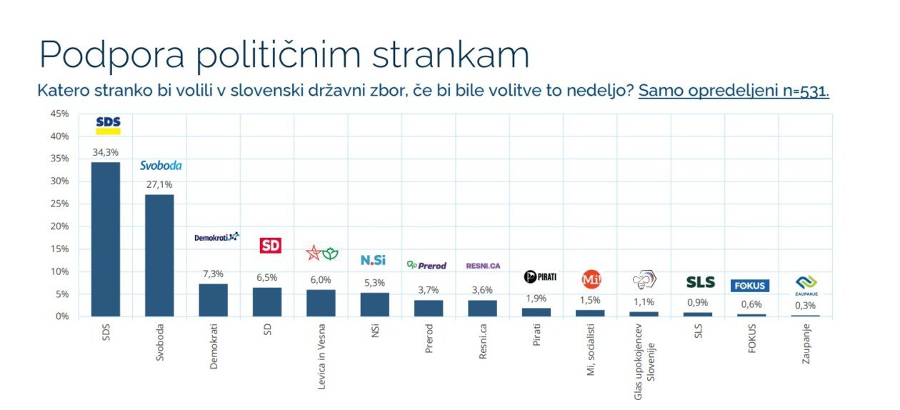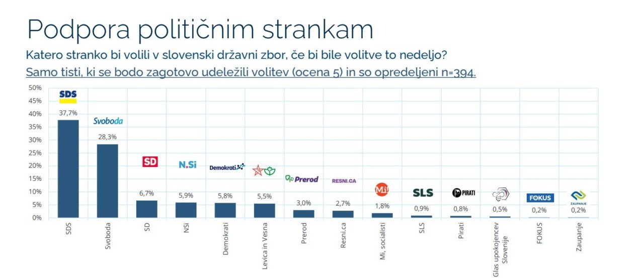 Med tistimi, ki se bodo zagotovo udeležili volitev in so opredeljeni, bi jih največ (37,7 %) podprlo SDS, sledi Svoboda (28,3 %), SD (6,7 %), NSi (5,9 %), Demokrati (5,8 %) ter združeni Levica in Vesna (5,5 %).