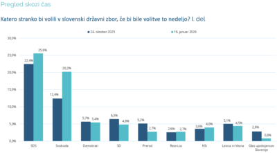 Še en graf pa prikazuje, kako se je spremenila podpora političnim strankam od 24. oktobra 2025 do 16. januarja 2026. SDS je na priljubljenosti pridobila za 3,2 odstotka, Svoboda pa za skoraj osem odstotkov.