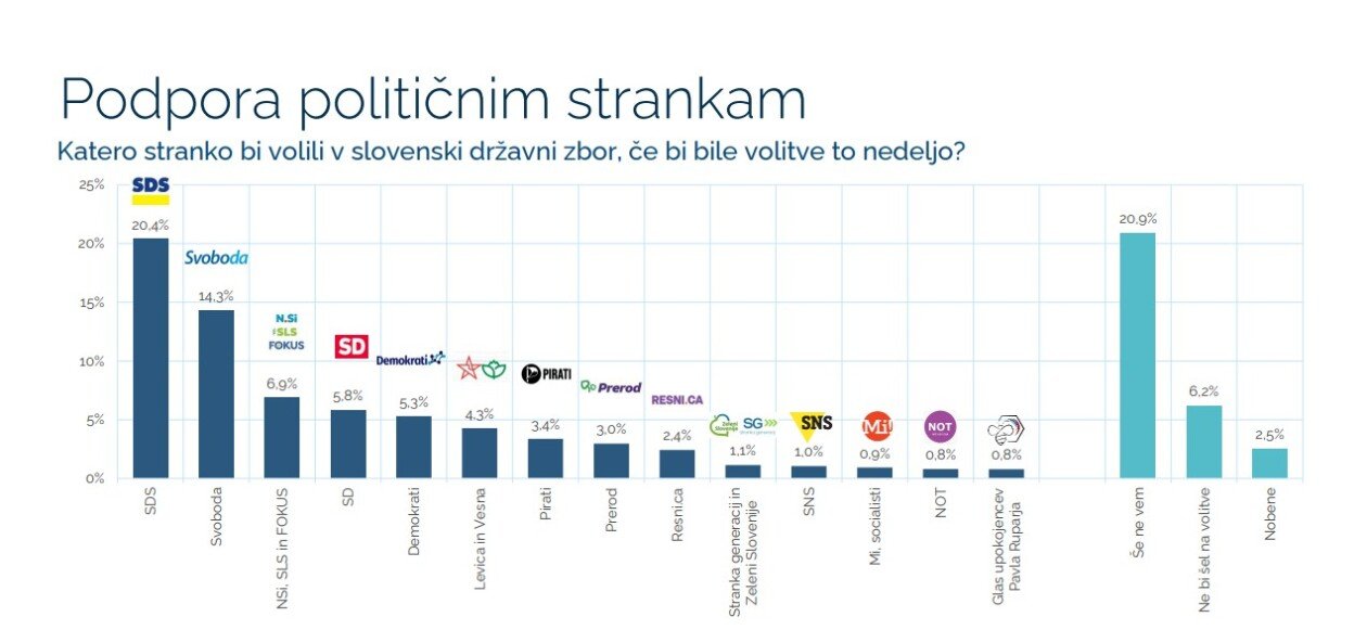 Na vprašanje “Katero stranko bi volili v slovenski državni zbor, če bi bile volitve to nedeljo?” pa je bil odgovor sledeč: največ anketirancev svojo podporo namenilo SDS (20,4 %), sledi Svoboda (14,3 %), združene NSi, SLS in Fokus (6,9 %), SD (5,8 %), Demokrati (5,3 %) ter združeni Levica in Vesna (4,3 %).